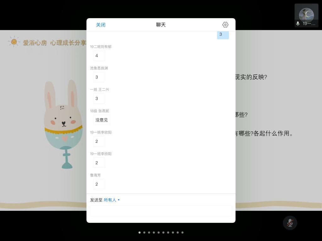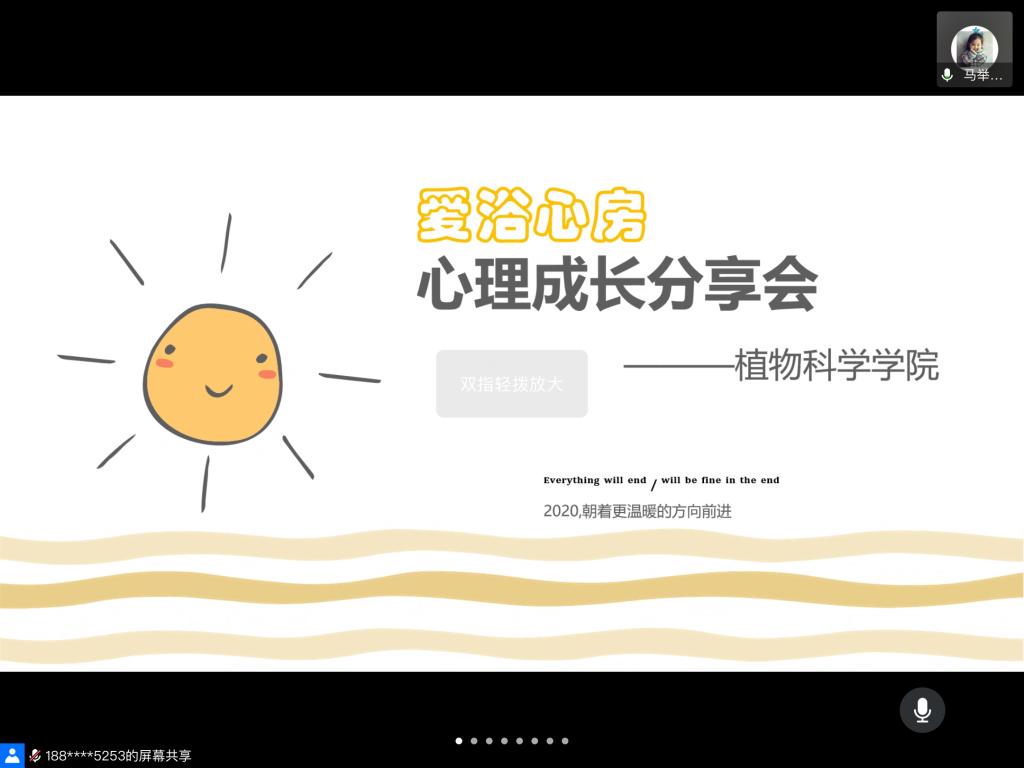 本次“爱浴心房”心理成长分享会活动为同学们提供了心灵沟通的平台,同学们通过分享自己在平时生活中认识到的一些有趣又有用的心理知识,互相学习和鼓励,树立了积极乐观的心态,做到了学习有热情、生活有乐趣,从而以良好的心态度过这个特殊的学期,度过同样丰富多彩的居家学习生活。