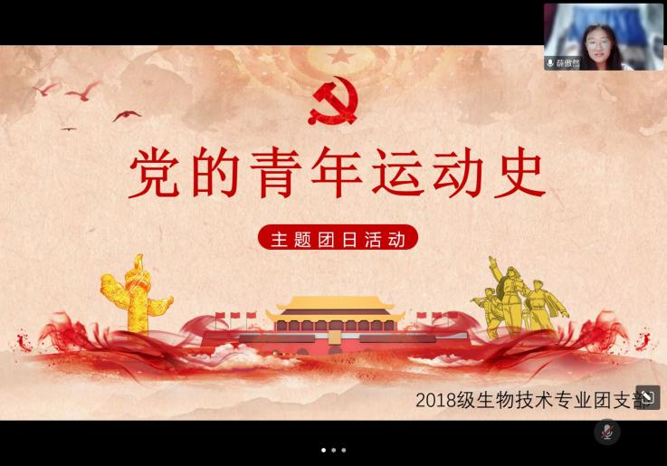 5月3日,2020级农学专业团支部于线上展开“永远跟党走,奋进新征程”主题团日活动,继续学习中国共青团的百年征程,为同学们介绍这百年来的峥嵘岁月。旨在鼓励全体团员学习党的精神,在新世纪的征途上,沐浴晨曦的阳光,唱着新一代春天的故事。