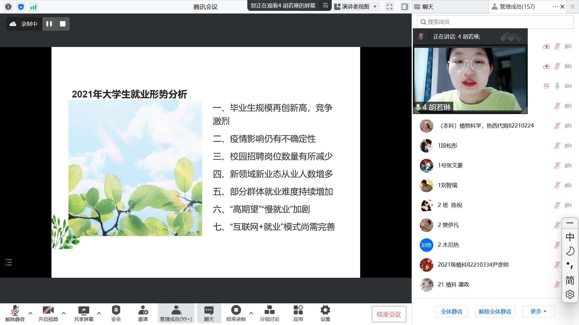赛后,高梦玉作总结发言。高梦玉首先对各组在资料收集、成果展示、小组协作等方面表示高度认可和赞扬,各组PPT制作风格不一,但都较为精美,小组成员在资料的查找上也做到了方向全面、内容优质。其次,高梦玉对本学期老员工职业发展与就业创业指导课程情况进行了总结,强调了大一年级开设职业规划课程的意义,希望同学们能够结合国家农业的发展情况及农学学科的特点,关注国家大事,紧跟时代变化,做好自身职业规划;建议同学们从现在开始要有意识的规划自己以后的道路和人生,向着既定的目标努力。