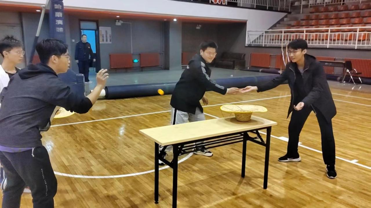 紧接着,游戏进入积分环节,同学们的情绪被渐渐带动起来。在游戏“投掷者”中,各位同学手拿草帽,凭借高超的投掷技术将乒乓球掷入目标之中。各组队员气吞山河蓄势待发,一次次投掷,是同学们追求胜利永不服输的体现,是各组队员团结一心同心协契的缩影。