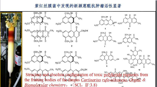 课题组从可以食用的野生蘑菇(紫红丝膜菌,Cortinarius rufo-olivaceus,网上有售,也叫贺兰山紫蘑菇,但是野生的蘑菇资源很少)提取物中共分离到28个红色,紫色或黄色的蒽醌类色素化学成分,其中,包括多个新化合物,部分结构见下图。我们经过试验,发现这些蒽醌色素不仅具有很强的抗氧化功效,而且具有抗肿瘤功效,效果和喜树碱等抗肿瘤药物接近,鉴于此,我们从该菌子实体上成功分离到菌丝体,并通过大量研究筛选到了高产色素的发酵培养基和培养条件,目前可以再发酵罐里大规模发酵生产其产生的色素,得到的色素成分与子实体色素相同,而且色价好,无任何毒副作用。可以用于食品色素添加剂,饮料色素或胭脂及口红色素。