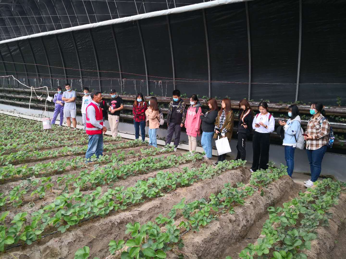 同学们在老师和当地技术人员的带领下参观了种植草莓、辣椒、葡萄等果蔬的温室大棚,深入了解了各种果蔬的种植技巧及栽培时的注意事项,系统地学习了各种有机肥的施用对盐碱地的改良作用。