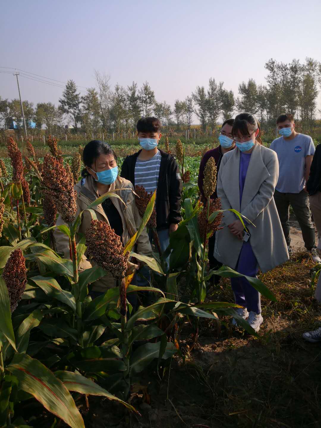 9月26日上午,同学们在禾谷类杂粮作物试验示范基地里直观地观察了不同品种高粱的性状。在试验田中,刘宏魁老师讲述了几种不同的育种方法及优缺点,同时,提到田间试验的一些相关内容。鞠会艳老师则重点讲述了植物营养的几种缺素症状,就地取材介绍了磷元素缺乏会使植株叶片呈现紫红色。