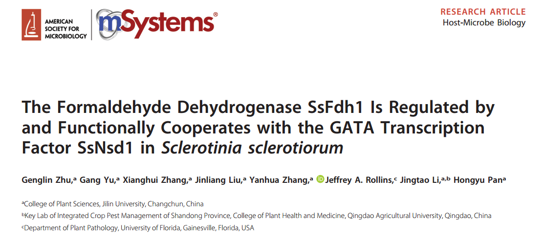 2019年9月10日,公海gh555000aa线路检测潘洪玉教授团队在美国微生物学会(American Society for Microbiology)旗舰下学术刊物《mSystems》(IF=6.519)在线发表了题为“The formaldehyde dehydrogenase SsFdh1 is regulated by and functionally cooperates with the GATA transcription factor SsNsd1 in Sclerotinia sclerotiorum”(doi.org/10.1128/mSystems.00397-19)的研究论文。本团队前期研究证明,核盘菌转录因子SsNsd1正调控子囊盘发育,而负调控精孢子产生(Li et al., 2018),但其对核盘菌无性发育与侵染垫形成的具体分子机制尚不清楚。本研究报道了谷胱甘肽依赖型甲醛脱氢酶(GD-FDH)受GATA转录因子SsNsd1的转录并与之互作,共同调控核盘菌菌核形成,侵染垫发育及其致病性,解析了核盘菌子实体发育及致病性的调控新机制,为深入揭示作物菌核病的可持续控制奠定了新理论。