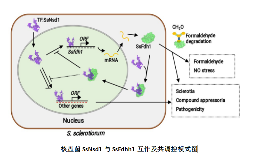 作物菌核病是由核盘菌(Sclerotinia sclerotiorum)侵染引起的一种世界性真菌病害。该病流行性强、分布广、危害重。本研究团队为进一步揭示SsNsd1对核盘菌子无性发育阶段的调控途径与调控网络,首先利用酵母双杂交的手段对SsNsd1的互作蛋白进行了筛选,对初步得到的互作蛋白进行了酵母双杂交(Y2H),双分子荧光互补(BiFC)以及免疫共沉淀(Co-IP)三重验证,最终确定了一个SsNsd1的互作蛋白为甲醛脱氢酶(SsFdh1)。功能研究表明,SsFdh1在甲醛降解、氮素代谢、菌核发育、致病性等方面发挥作用。SsNsd1与SsFdh1均具有典型的半胱氨酸维系的锌指基序(Cys-X2-Cys-X13-Cys-X2-Cys/Cys-Xx-Cys)。SsNsd1以两种不同的方式调节SsFdh1: 一是,SsNsd1在SsFdh1的启动子区域直接结合其上的GATA-box调控SsFdh1的转录((A/T)GATA(A/G)—439,—446);二是,SsNsd1通过其与SsFdh1锌指区域内半胱氨酸形成的二硫键与SsFdh1结合(SsFdh1C44-S-S-C331SsNsd1 和SsFdh1C173-S-S-C334SsNsd1)。SsNsd1-SsFdh1的相互作用可以阻止SsNsd1与含有GATA-box的DNA之间的结合。定点突变锌指基序中的半胱氨酸残基,能显著地影响SsNsd1-SsFdh的相互作用以及SsNsd1对DNA的约束能力。SsFdh受SsNsd1的调节并与之共同起调控作用。该研究为核盘菌无性发育与致病性调控机制新突破,并为丝状真菌发育转录调控机制提供了新见解。