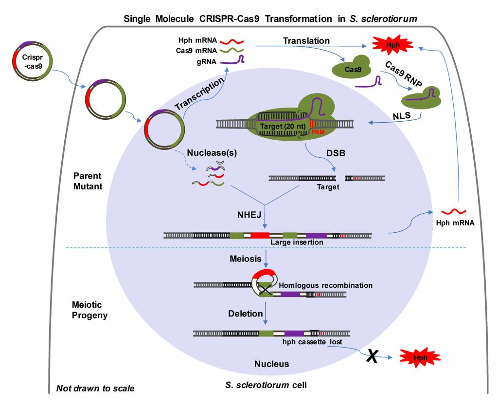 核盘菌(S.sclerotiorum)是引起作物菌核病的一种重要的植物病原真菌。其寄主范围极广,病害易流行。公海gh555000aa线路检测潘洪玉教授带领的“作物重大病害流行预警及其绿色综合防控关键技术研究”吉林省重大科技研发人才团队,多年来致力于核盘菌致病和发育分子机理的研究。然而,基于传统的基因突变技术(同源重组、基因沉默、T-DNA插入及UV诱变)存在效率低、不稳定等问题,制约了核盘菌致病基因功能的研究,因此,急需开发新的、高效、经济及简便的基因突变技术。CRISPR技术是在上个世纪九十年代初发现的并在近几年迅速成为人类生物学、农业和微生物学等领域最流行的基因编辑工具。该论文报道了核盘菌CRISPR-Cas9介导的基因编辑策略及该技术在核盘菌未知基因功能领域的应用。该研究发现将编码Cas9、靶标sgRNA和标记基因的质粒转化到核盘菌中后,可对靶标基因造成高频率的插入突变。研究发现核盘菌在Cas9蛋白造成靶基因双链断裂(DSB)后,并在非同源末端修复(NHEJ)机制下将降解的质粒片段随机组合并整合到DSB位点,造成大片段插入的靶基因突变。因此,筛选标记(HygB)的辅助下,即可以获得含HygB抗性的插入突变体。该研究还发现,随机整合的大片段在同源序列存在的情况下,经核盘菌有性生殖阶段会因同源重组而发生片段丢失,因此又可以在子囊孢子中筛选到HygB抗性丢失的子代突变体。该编辑体系模型在三个独立的核盘菌野生型上进行了验证,并实现了对草酸相关基因(SsOah1)及黑色素相关基因(SsPks13)进行了高效突变。该研究结果不仅进一步确定了草酸在核盘菌致病上的关键作用,还发现了其对菌核和侵染垫的数量也有重要影响;同时发现侵染垫的色素积累对核盘菌的侵染及致病性无显著影响。CRISPR-Cas9技术在核盘菌中的开发和运用将进一步推动核盘菌后基因组时代,也会加速核盘菌致病相关基因的挖掘与功能研究,对于快速鉴定核盘菌新的致病因子及最终实现病害防治具有重要意义。