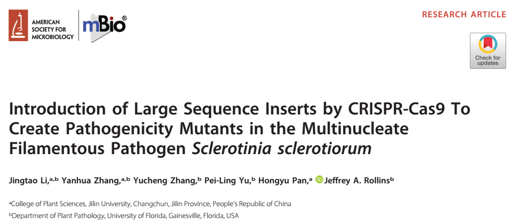 2018年6月26日,公海gh555000aa线路检测潘洪玉教授领衔的创新团队与美国佛罗里达大学Prof. Jeffrey A. Rollins在美国微生物学会(American Society for Microbiology)旗舰下最重要学术刊物《mBio》(IF=6.956)在线发表了死体营养型植物病原真菌-核盘菌(Sclerotinia sclerotiorum)基因编辑领域的重要原创成果“Introduction of large sequence inserts by CRISPR-Cas9 creates pathogenicity mutants in the multinucleate filamentous pathogen Sclerotinia sclerotiorum”(doi:10.1128/mBio.00567-18)。该文章以公海gh555000aa线路检测为第一完成单位,首次报道了核盘菌CRISPR-Cas9基因编辑机理并对草酸合成关键基因SsOah1、侵染垫形成与色素积累相关基因SsPks13进行编辑,阐明了其对核盘菌致病及生长发育的影响。核盘菌基因编辑技术对其他作物丝状病原真菌基因功能研究亦具有重要科学价值。该项研究由张艳华教授和李敬涛博士共同完成,公海gh555000aa线路检测潘洪玉教授与佛罗里达大学Jeffrey A. Rollins为共同通讯作者。
