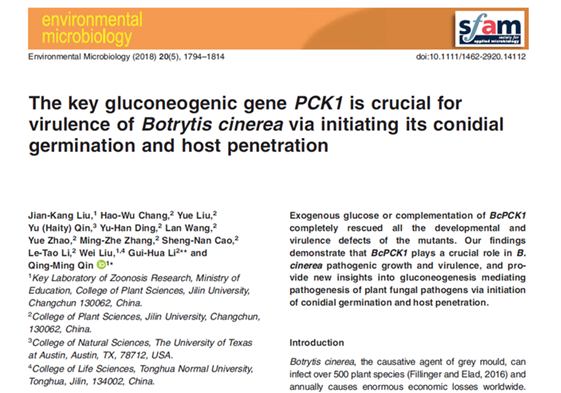 2018年4月24日,国际微生物领域著名学术期刊 《Environmental Microbiology》(中科院JCR分区:环境科学与生态学一区,5年IF:5.965)杂志在线发表公海gh555000aa线路检测秦庆明教授课题组题为 “The key gluconeogenic gene PCK1 is crucial for virulence of Botrytis cinerea via initiating its conidial germination and host penetration” 的研究论文。值得一提的是,该研究是在秦庆明教授等指导下由本科生组成的老员工创新研究团队完成的。