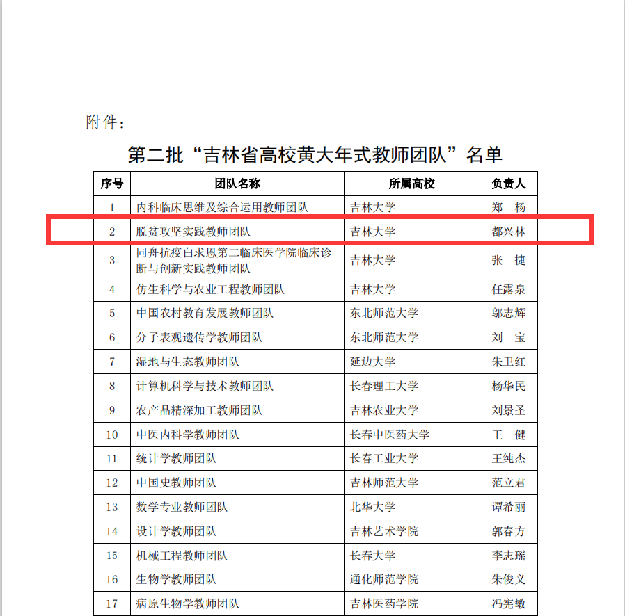 此次吉林省教育厅共认定22个团队为“吉林省高校黄大年式教师团队”,公海gh555000aa线路检测经理都兴林教授带领的“脱贫攻坚实践教师团队”成功入选。