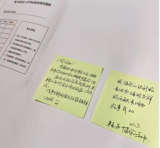 3月14日,8号公寓1名研究生获知其申请的博士考核单位将于3月16日-17日进行线上考核,复试要求自行准备B4双面答题卡2份,并在独立、封闭的空间完成。得知此事后,秦建春多次与公司、考生、复试考核单位等积极沟通,一方面联系校区学工办的老师们帮忙打印,另一方面与公寓管理部门协调安排空寝室为员工提供复试场地。3月15日上午,一切准备就绪,在送给该名员工的答题卡上,贴着两张绿色的便利贴,上面写着: