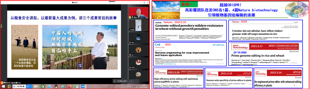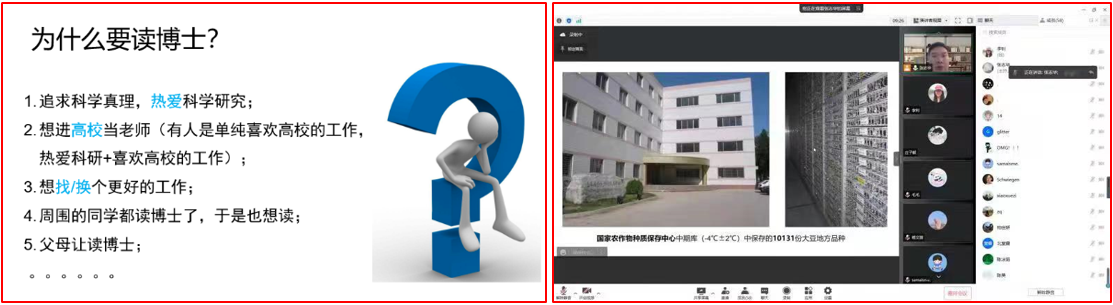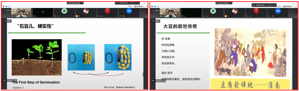 大豆是重要的粮油兼用作物,是人类优质蛋白的主要来源,关系国计民生的重要基础性、战略性物资,是最具经济效益的作物,在农产品贸易领域扮演着举足轻重的角色。4月8日晚7:00,王英教授围绕“源于华夏,繁盛千年——大豆的前世今生”这一主题,介绍了大豆生物学特性,分析了大豆经济产量低的原因,以及大豆生产面临的挑战和困境。也从进化角度、考古角度、文化传承角度、大豆向世界传播角度,证明大豆起源于中国,阐释了大豆从野生豆进化到栽培豆的重大事件和历史沿革,并解释了重要农艺性状驯化过程中,我们祖先对性状改良的原因及现今科研人员对于重要性状的遗传解析成果。通过大豆出土,适应环境,阐明大豆具有承受压力、积极适应,乐观向上的精神,以物喻人,以激励员工与疫情做斗争。通过古诗词、豆腐发明、豆油的食用,以及大豆在各历史阶段的重要性排序,解释了大豆在我国历史上的贡献。通过我国大豆与美国大豆单产、高产记录,分析我国大豆生产中存在的差距,查摆问题,提出解决方案。也通过我国建国以后大豆生产和科研所取得的成就,激励员工投身农业科研事业。