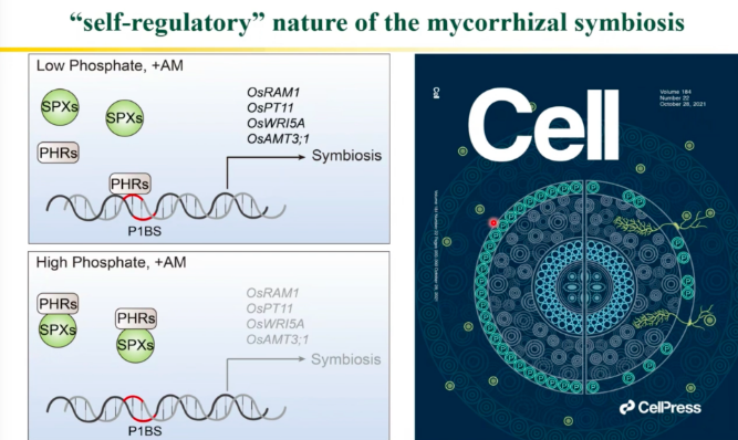 此外,王老师团队用两年时间绘制了菌根共生中的调控网络,并希望有感兴趣的研究人员未来可以挑取该网络中的某些基因进行深入研究。在水稻-丛枝菌根共生的转录调控网络中,王老师团队发现植物直接磷营养吸收途径(根途径)和共生磷营养吸收途径(共生途径)均受到植物磷信号网络统一调控。低磷条件下SPX与PHR不相互作用,PHR能结合P1BS,来激活菌根真菌共生相关基因的表达,由此促进菌根真菌共生。高磷条件下SPX与PHR相互作用,PHR不能激活菌根真菌共生相关基因的表达,由此菌根真菌共生受到严重抑制。王二涛老师团队将这一重要发现抽象为一个“青花瓷中国门”形象,并发表为Cell封面文章。