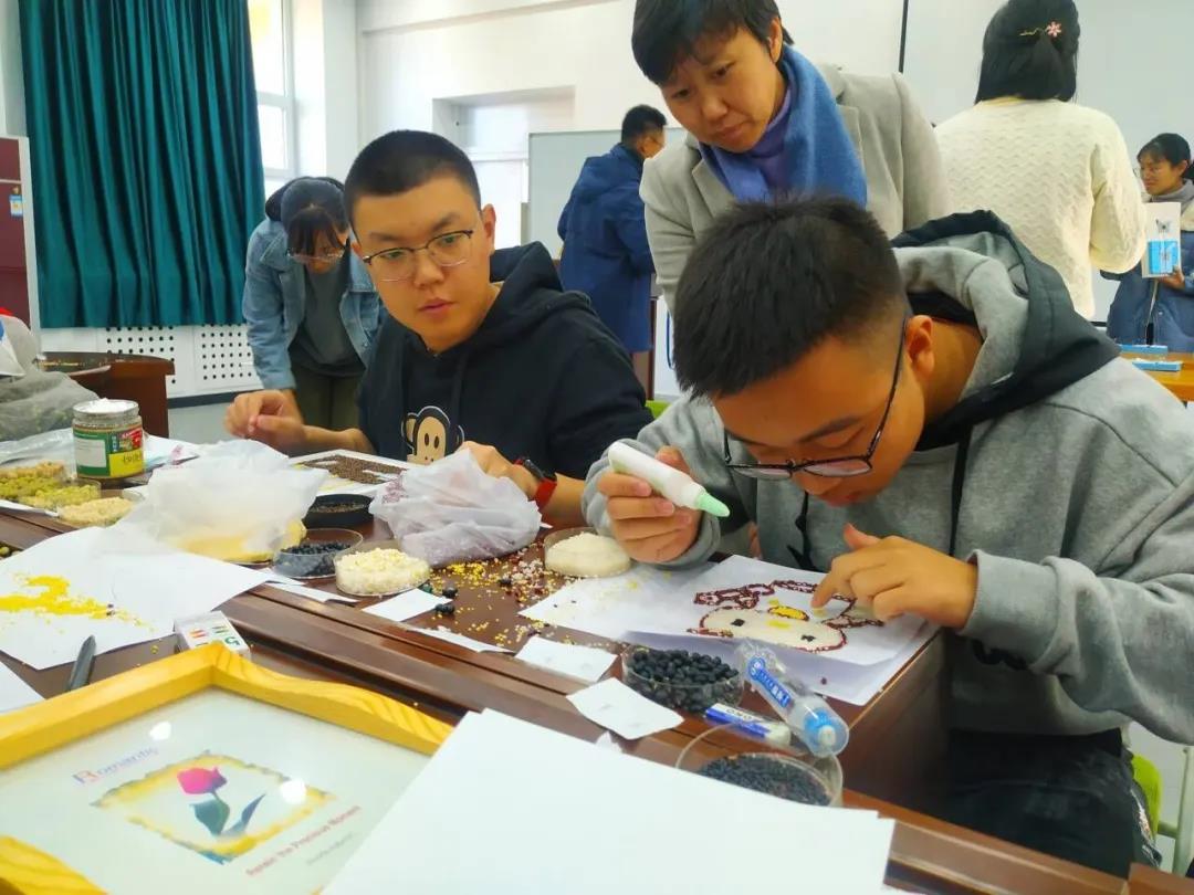 王英老师带领的研讨小组进行了种子作画活动。王老师首先向小组各位成员介绍了完成种艺画所需的原材料:黄豆、绿豆、红豆、黑豆、大米、小米以及其他植物种子。随后王老师在事先精心准备的作画底稿上为同学们做了详细的示范,并着重强调了相关注意事项以及在制作种子画过程中可能出现的问题。小组成员在老师的指导下认真地开始用种子作画,在作画过程中遇到问题积极与老师进行讨论,并交流自己的创意。
