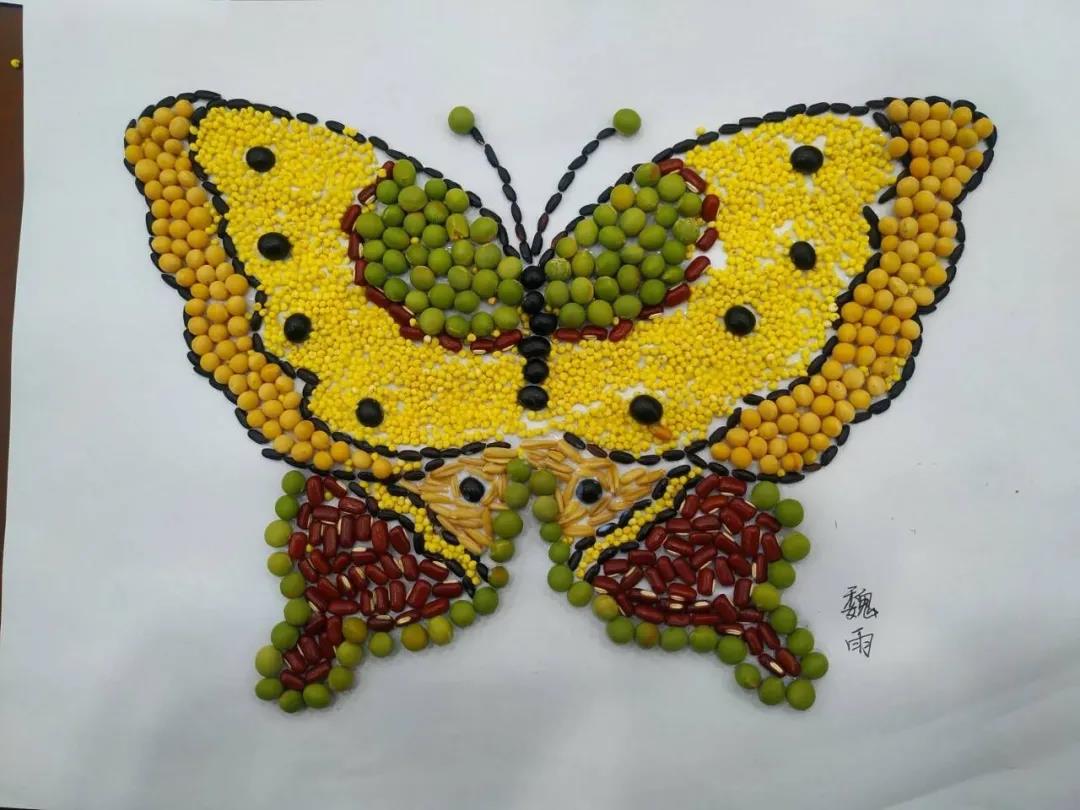最终,在老师们的悉心指导和帮助之下,新生研讨小组的同学们均创作出了较为理想的作品。种子作画小组制作了哆啦A梦、小熊维尼、HELLO KITTY等多种造型的作品。蝴蝶标本制作小组将标本摆放成蝴蝶的形状,象征着同学们的梦想像蝴蝶一样翩翩起航。