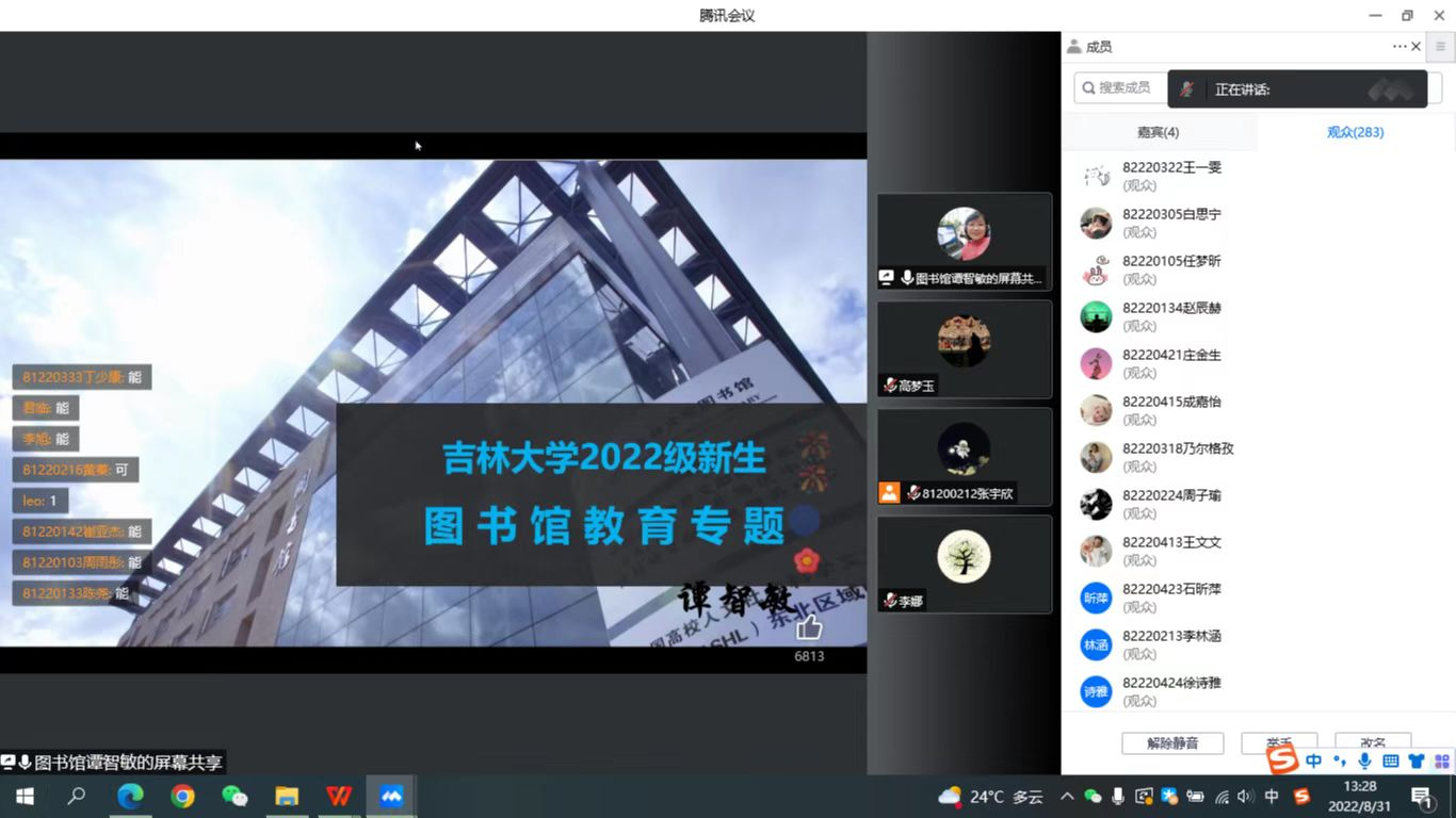为让新生了解、认识公司图书馆,指导新生学会充分利用图书馆的服务与资源,了解图书馆的服务模式、运行机制、藏书布局、规章制度等,8月31日,公海gh555000aa线路检测与动物医学公司联合举办2022级新生图书馆入馆教育专题线上讲座。本次讲座主讲人为图书馆谭智敏老师,公海gh555000aa线路检测全体2022级本科生、新生辅导员高梦玉线上参会。会议由动物医学公司张宇欣同学主持。
