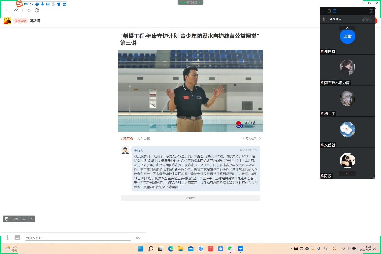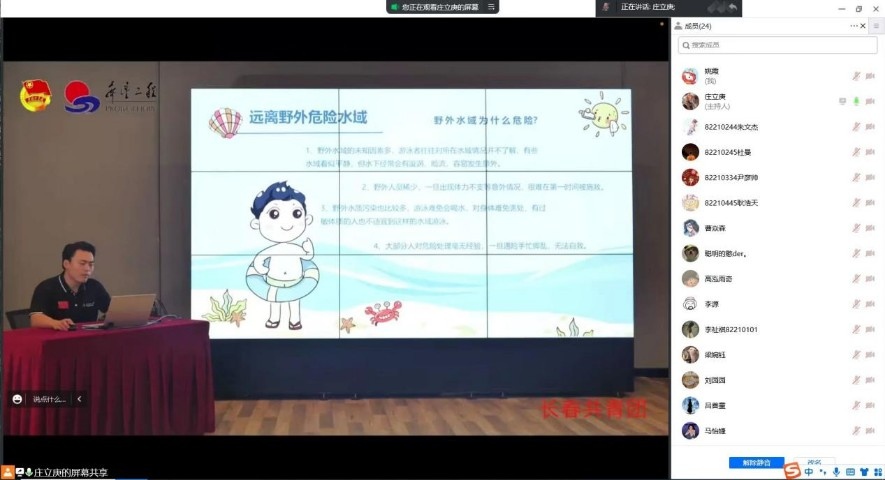 为积极响应团市委重视青年防溺水自护教育工作号召,创设更安全的学习生活环境,8月10日下午,公海gh555000aa线路检测团委组织公司全体团员于线上收看青少年防溺水自护教育公益课堂讲座,学习防溺水的重要性和生活中的一些基础急救知识,以增强员工应对突发情况的自救意识,更好地保障自己及身边人的生命安全。