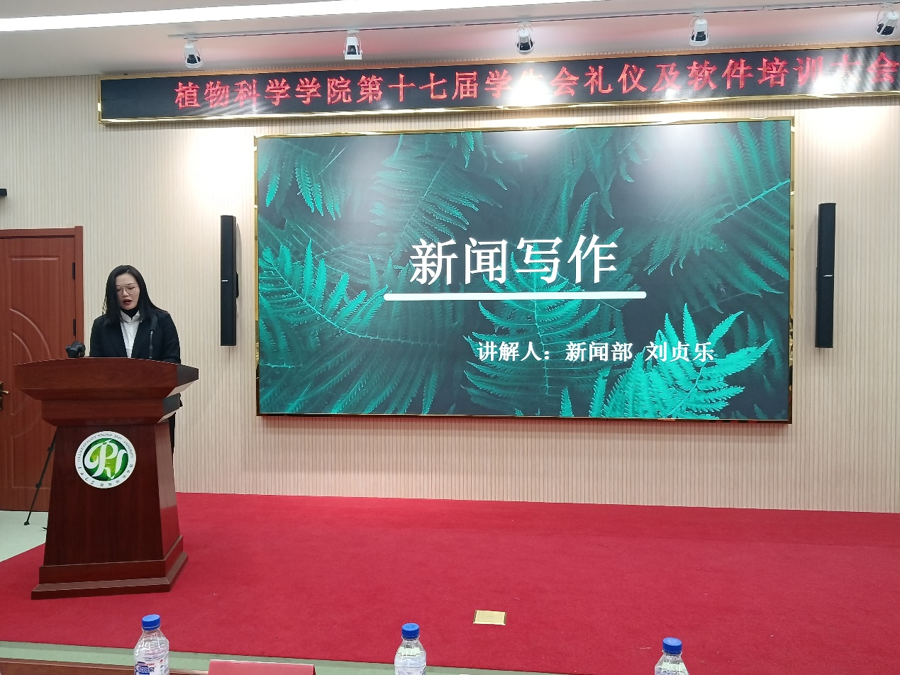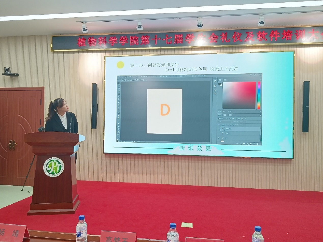 讲解人朱禹彤强调了礼仪的重要性并就接待、交谈、服装、仪态行为角度进行了图文并茂的介绍,礼仪演示人通过现场示范基本站姿坐姿与西服穿法,切实加深了同学们对礼仪知识的认识。志工部讲解人李俐晓以简洁扼要的语言向大家介绍了策划案的含义、构成及其活动流程与相关事项。新闻部讲解人刘贞乐从新闻稿的六要素、结构、特点、基本要求等方面生动详尽地展示了如何写就一篇好新闻。技术部成员杨涵、徐诗雅、杨雨珊依次分享实用软件小技巧,就如制作层次感流体页面、水波浪动画、PS折纸效果等方面进行讲解,并对其中的易犯错误做了重点提醒,直观地展示了办公软件的魅力。新闻部成员张艺晓对摄影基础知识、照片构图、拍摄角度与后期修图进行了详细的阐述,加深了同学对“凝固时间之艺术”的理解。